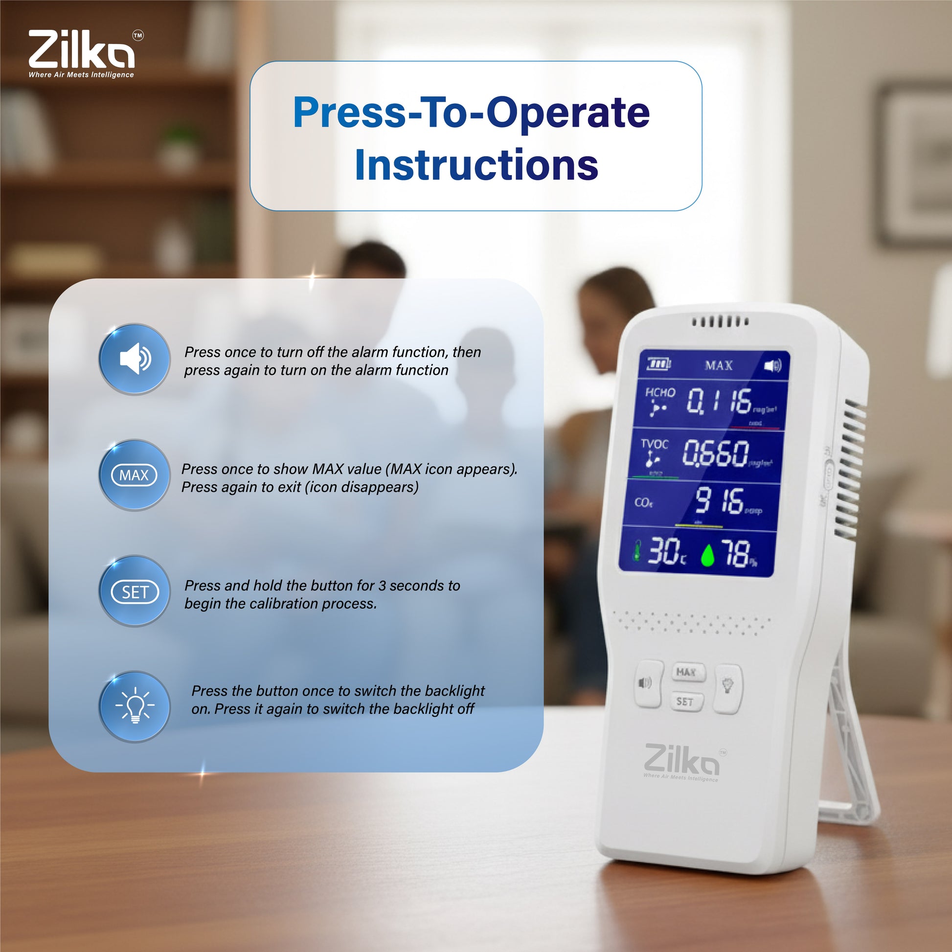 Breathe smarter with the Zilka 11-in-1 Air Quality Monitor. Detects PM2.5, PM10, CO₂, CO, TVOC, formaldehyde, and more in real time with next-gen SEN+ sensors. Features a 2.8” Blue LED display with instant color alerts, 2000mAh rechargeable battery (13 hrs), and compact portable design. Ideal for homes, offices, schools, cars, hospitals, and workplaces. Protect your family, improve health, and monitor air quality anywhere. Zilka — Because every breath matters.